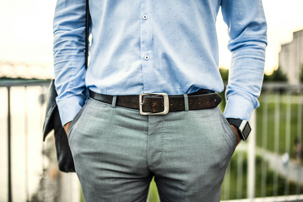 - Till arbetet: Ett klassiskt läderbälte i svart eller brunt som matchar skorna.